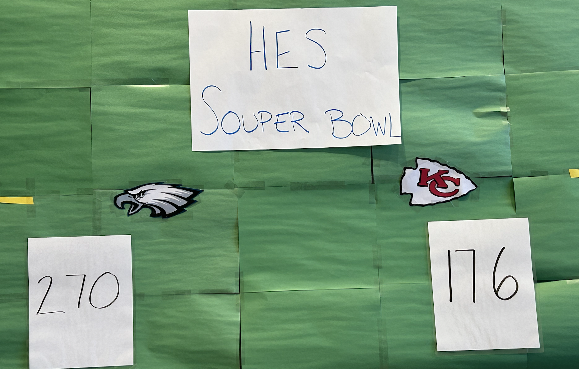 The HES SOUPer Bowl was a big success! Students earned points for either the Eagles or Chief by bringing in cans to donate and doing acts of kindness. Just like in New Orleans, the Eagles beat the Chiefs by quite a margin! All of the soup can will be donated to Loaves and Fishes this Friday.